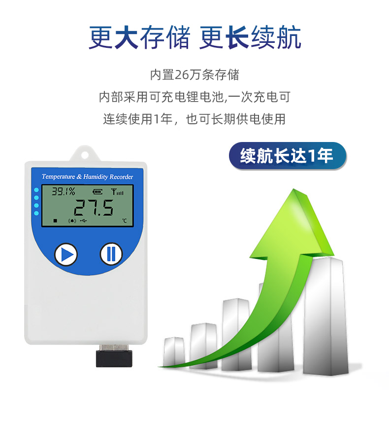 建大仁科智能溫濕度記錄儀COS-04自帶高精度溫濕度傳感器,可進行溫濕度測量,且自帶存儲功能,可記錄8萬條溫濕度數據,高配版可記錄26萬條溫濕度數據。設備配備液晶屏,可實時顯示溫濕度數據,采用大容量可充電鋰電池,充電一次可以使用一年,方便運輸人員的使用。