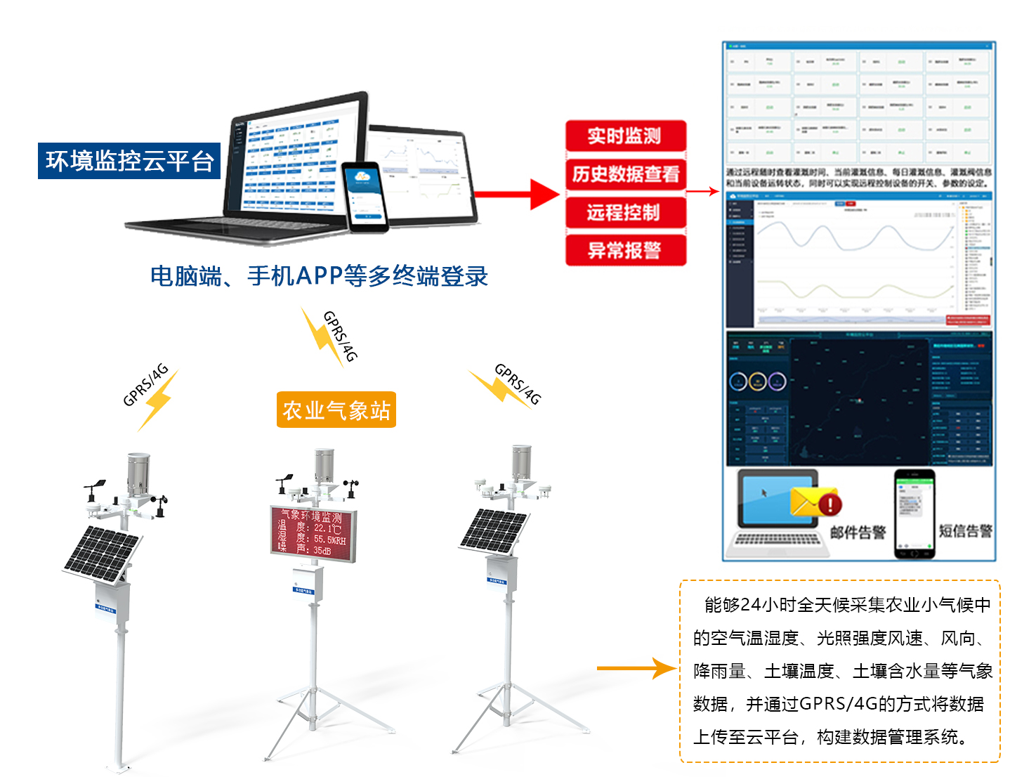 2、農業氣象站體積小、重量輕、低功耗低成本、易廣泛網格化部署,免維護、易安裝、無移動部件,可選市電、太陽能供電,可選有線、無線通信,如使用太陽能系統方式供電、無線通信,可保證連續一周陰雨天情況下無斷電穩態工作,并節省鋪設電纜、光釬費用。