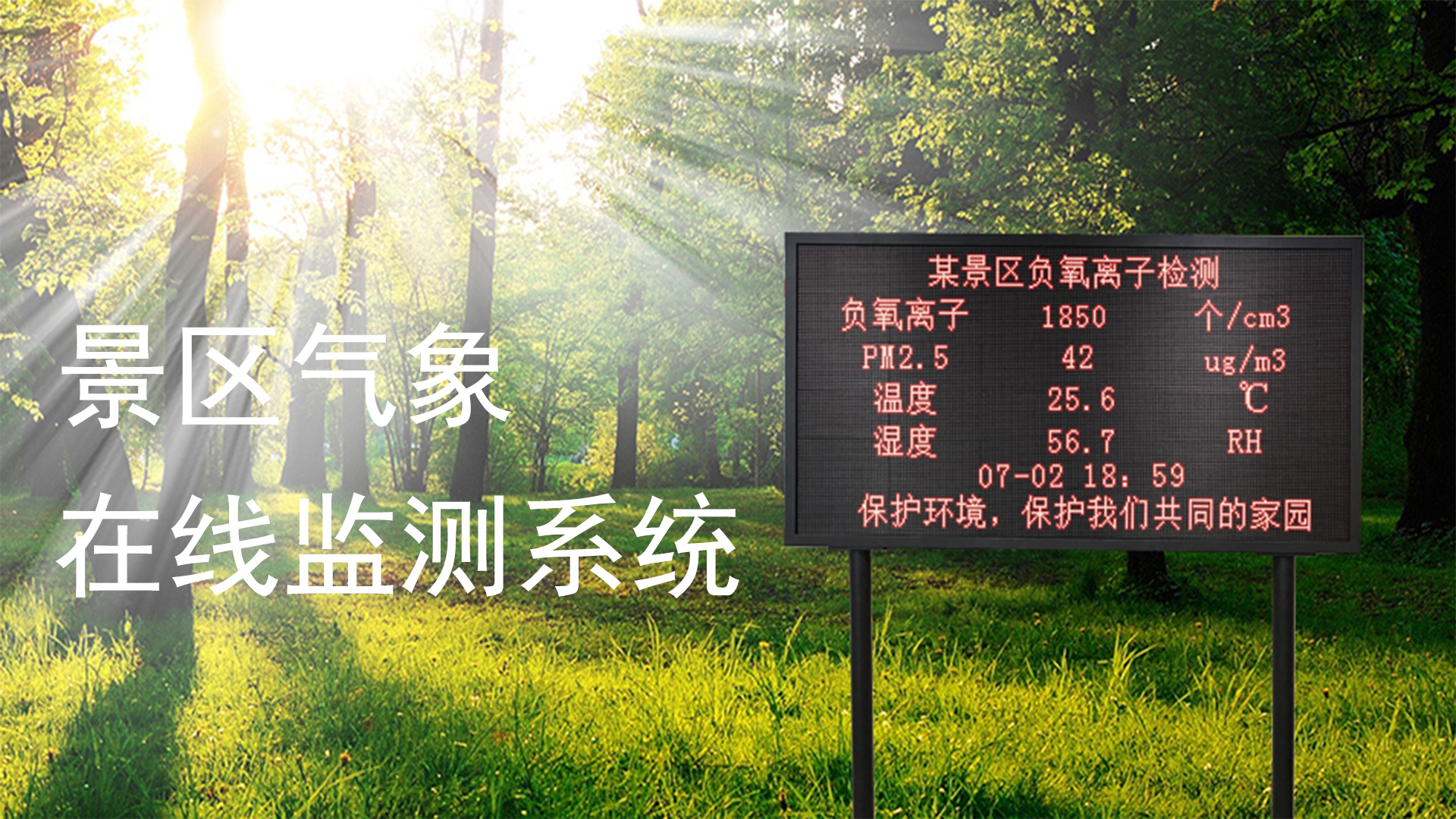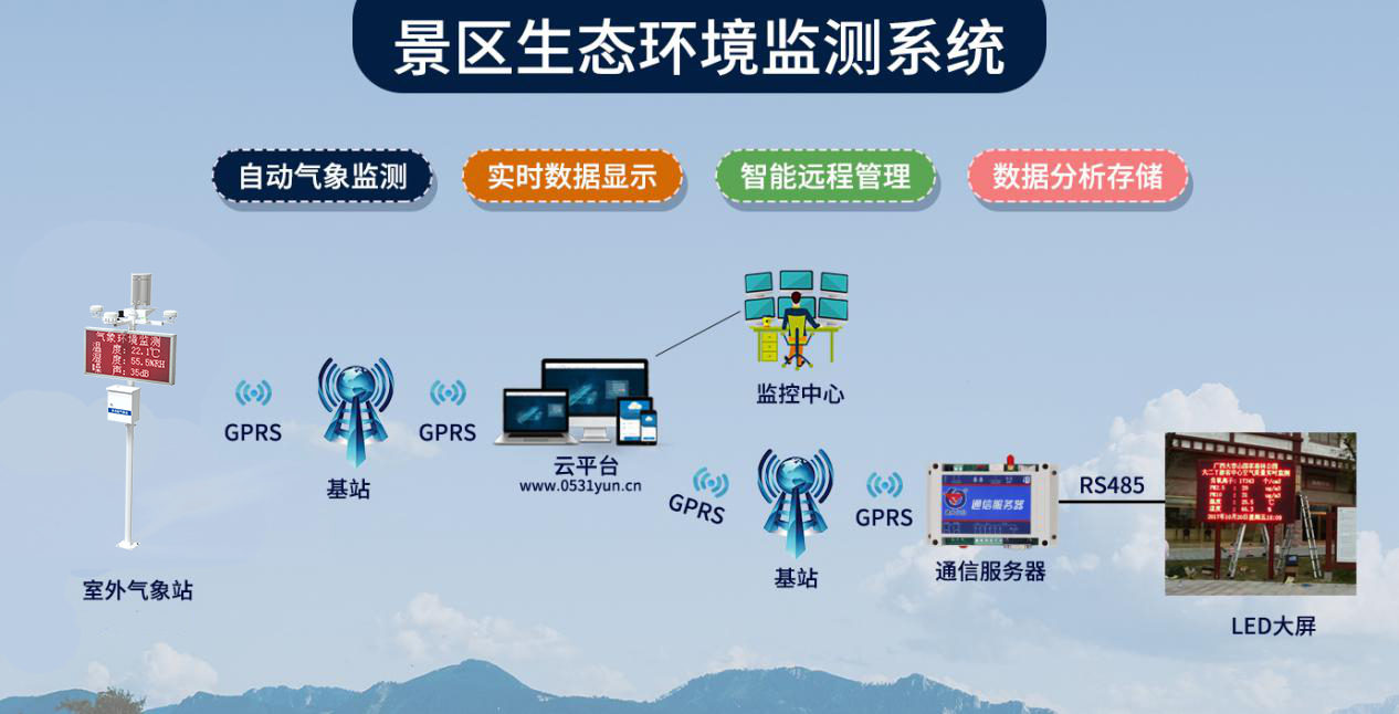 建大仁科的景區環境監測系統由監測終端景區氣象站、數據傳輸技術、管理軟件云平臺、通訊服務器、LED顯示屏組成,具有自動氣象監測、實時數據顯示、智能遠程管理、數據分析存儲的功能。