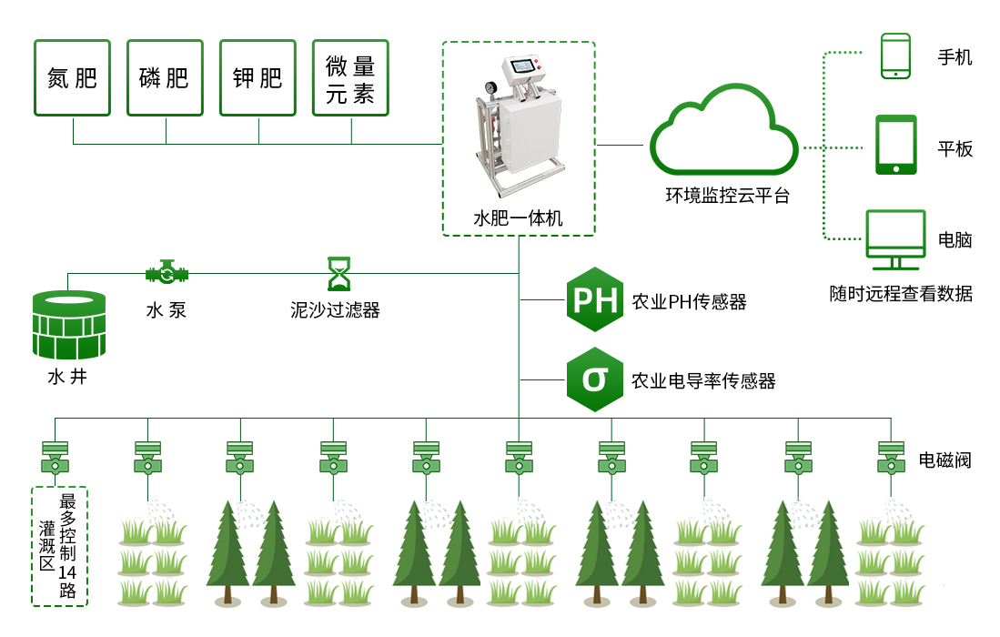 智能水肥一體化系統:與傳統的灌溉方法相比,仁科水肥一體化智能灌溉系統采用傳感器、物聯網、云計算等多項技術,集灌溉和施肥于一體,由水肥一體機、土壤墑情采集終端(土壤溫度水分電導率三合一變送器、土壤氮磷鉀變送器、土壤PH變送器)、過濾系統、閥門控制器、電磁閥、田間管路、監控軟件云平臺組成,具有節水節肥、節省人力的特點。